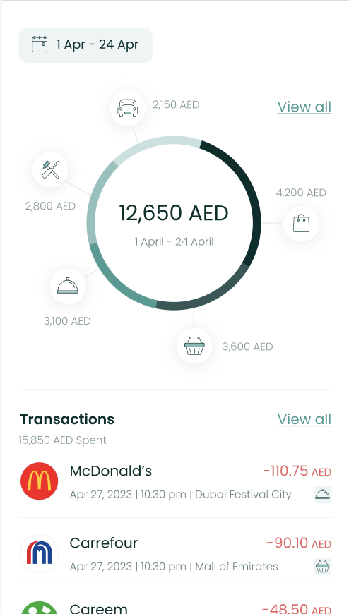 The ExpenseComponent shows the user's spend across categories in a neat donut chart, along with a list of recent transactions. Users are able to view data for previous months easily too.