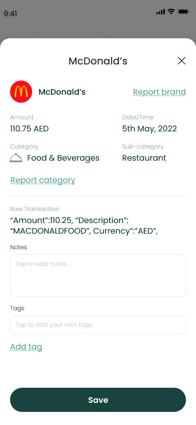 The TransactionDetailComponent shows users information about a specific transaction and allows them to update its category or Brand, in case they are inaccurate.