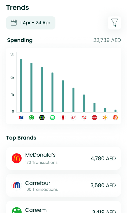 Besides showing the user's spend on each Brand, the BrandTrendsComponent uses a chart to show the user's spend per day. It also allows users to filter data by category, tags and dates by default.